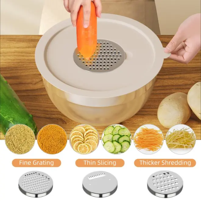 This bowl set comes with 3 different grater attachments (slicing/grating/shredding) just shred or slice right into the bowl! without making a mess and eliminating the need for a cutting board to clean. 3.5qt had a removable lid inside the main lid, for adding contents or pairing it with your blender without removing the entire lid to prevent splash.